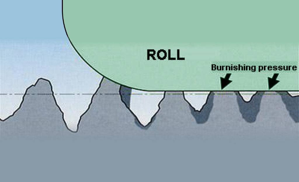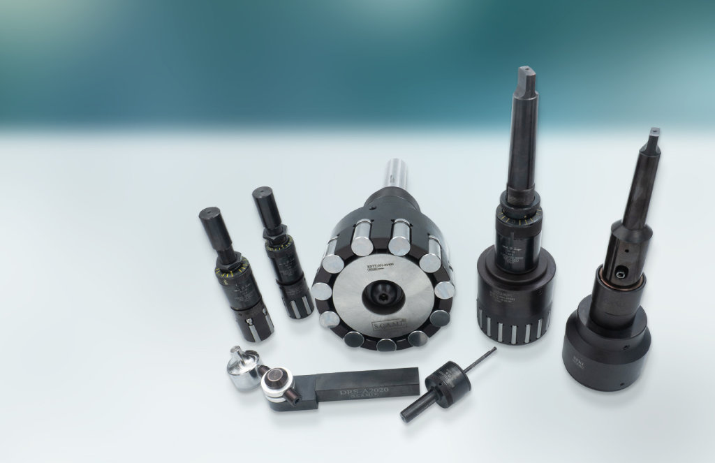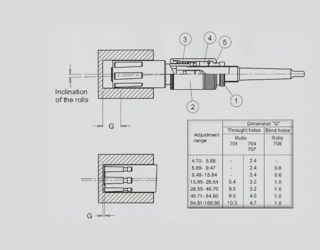 The roller burnishing tool must be aligned with the workpiece (maximum error 0,1); if there are doubts on the alignment error, a floating shank is needed. When the tool is in the bore, the cone pushes the rolls onto the surface to be burnished. The cage retains the rolls in an angled position to the axis of the tool, so the pressure of the burnishing generates a self feed that draws the tool into the bore. When self feed is not required, i.e. blind hole applications, you must use a cage which holds the rolls parallel with the axis of the tool. If the machine feed is stopped or slower than the natural rate, the rolls pull the cage, held in position by the release spring (item 3), and they then release from the surface of the bore. The release of the rolls permits the quick retraction from the bore (see table dimension "G"). The release spring will ensure the rolls are in the correct position to burnish the required diameter. The roller burnishing tool requires lubrication not cooling. A plentifull supply of lubricant must be fad directly to tool to provide a good flushing and cleaning action. It is recommended that a filter is fitted to the lubrication system to prevent the circulation of chips which may cause damage to the burnished surface and the tool.